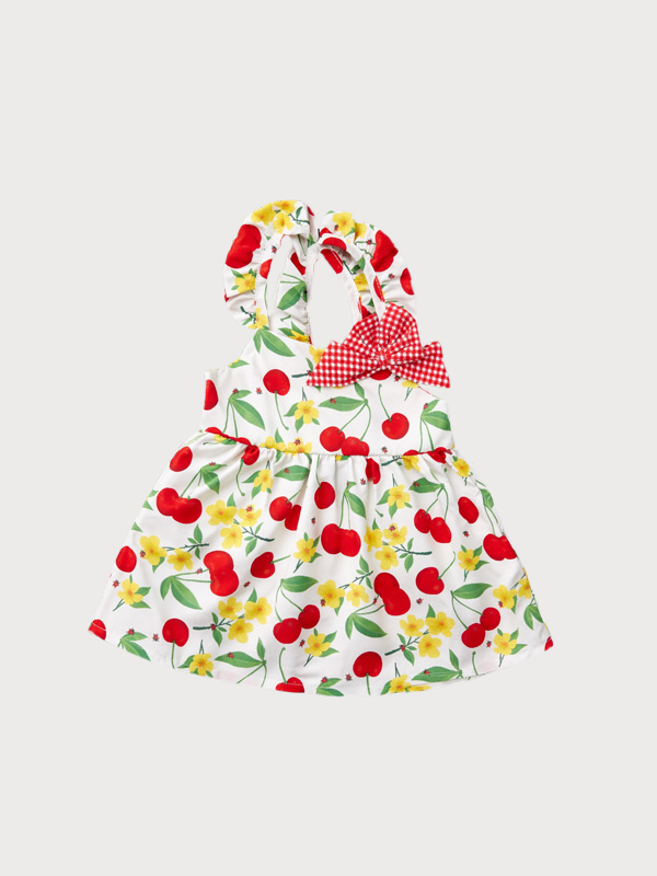 Conjunto de baño para niña compuesto de vestido con badana con estampado de cerezas y detalle de lacito y culetin estampado de vichy y detalle de volantitos.